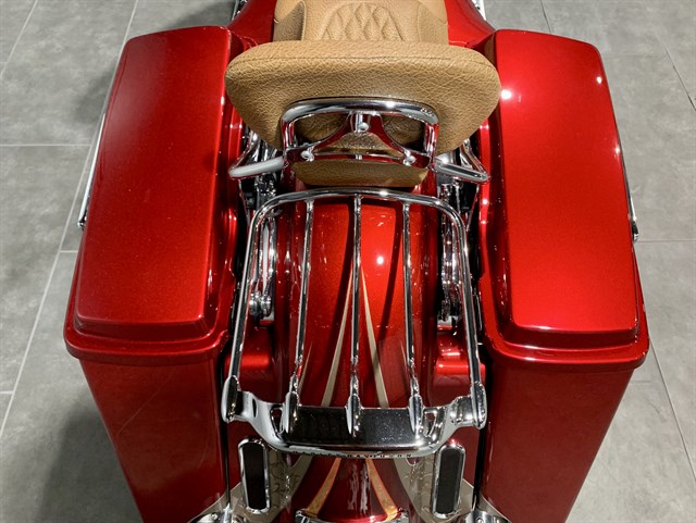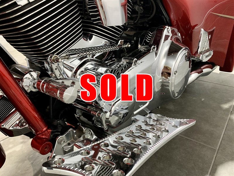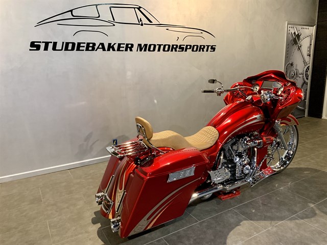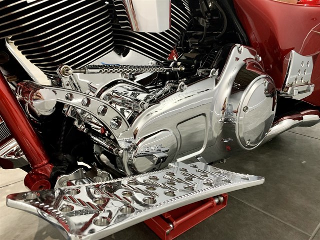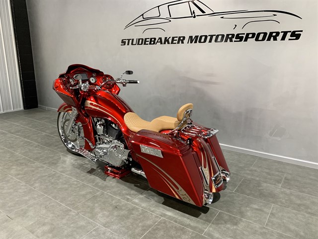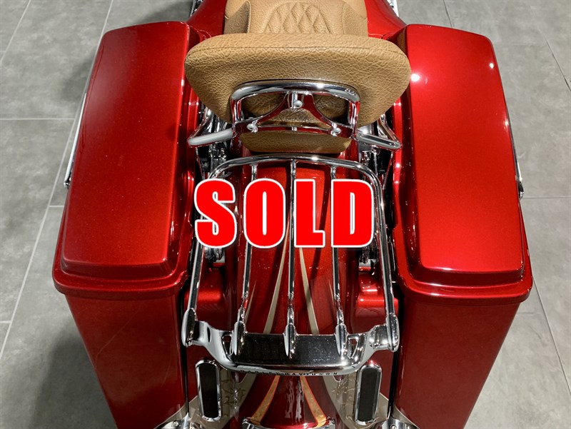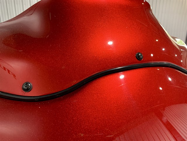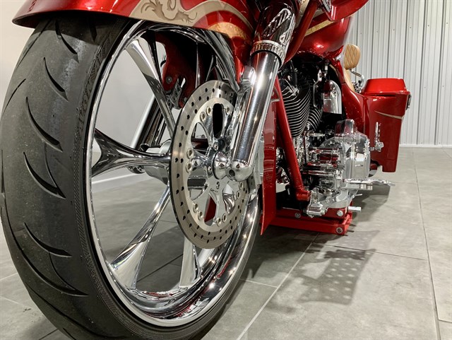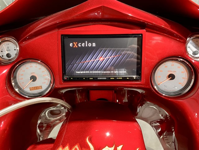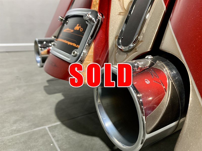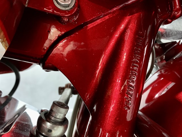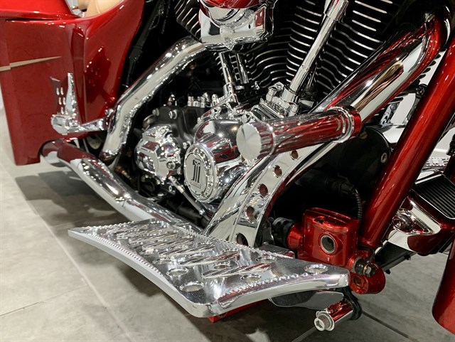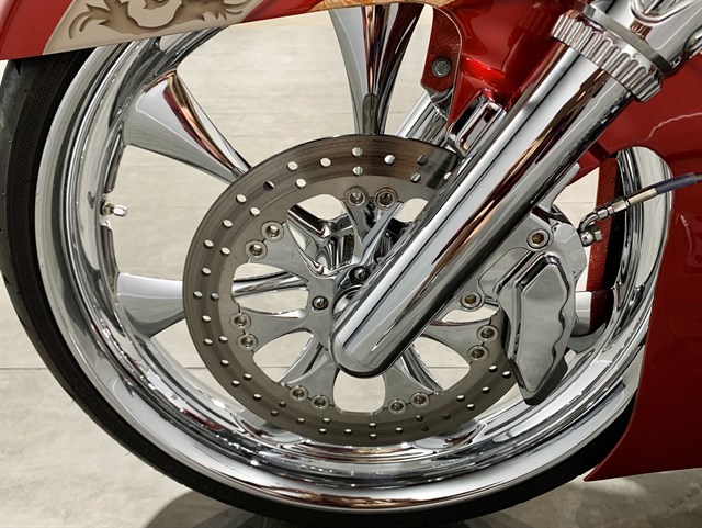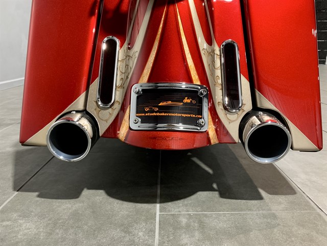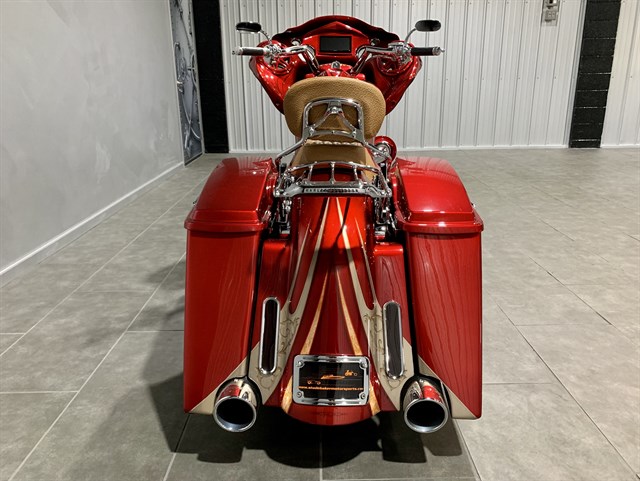It's coated in gorgeous Candy Apple Red paint over silver base, champagne graphics and gold leaf accents. This bagger looks rich and classy!
