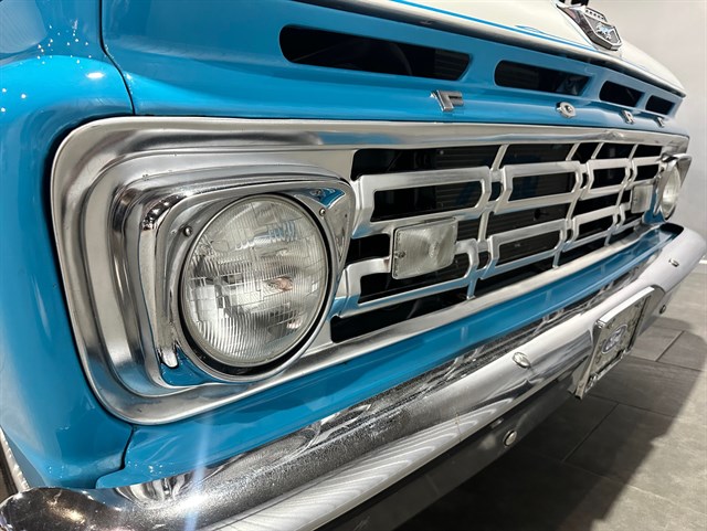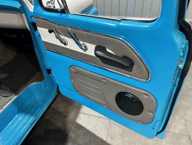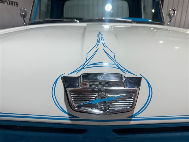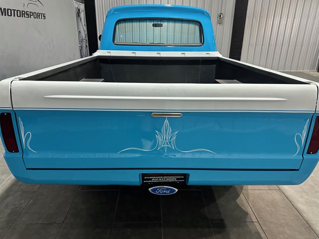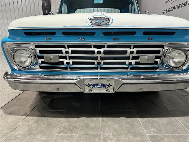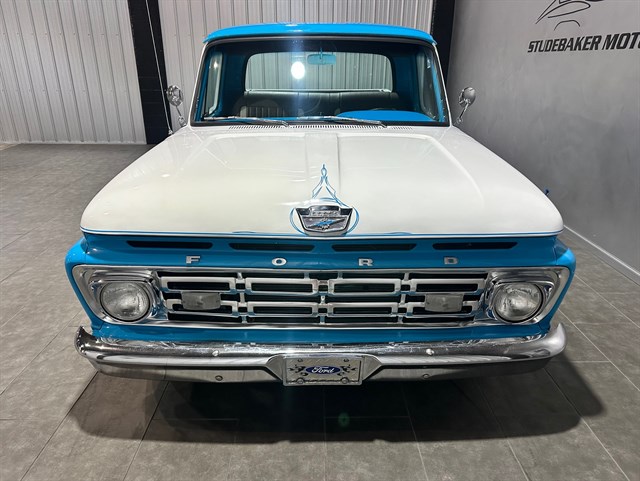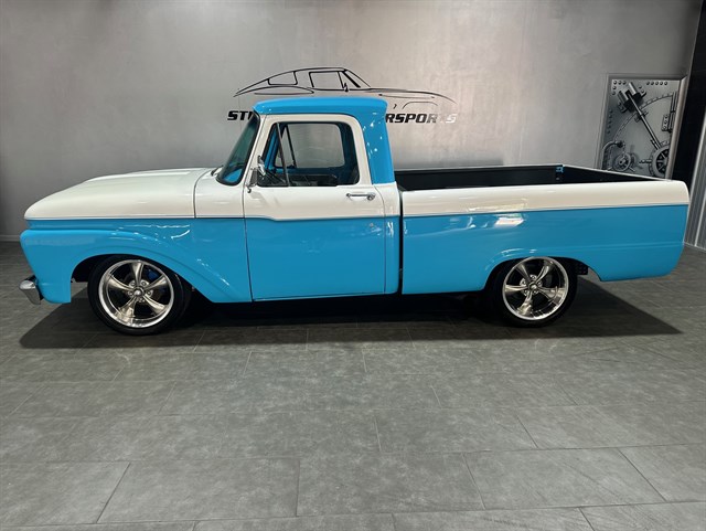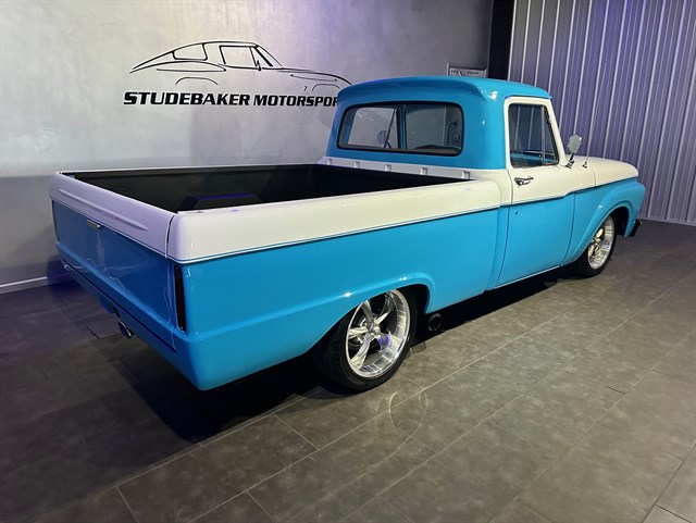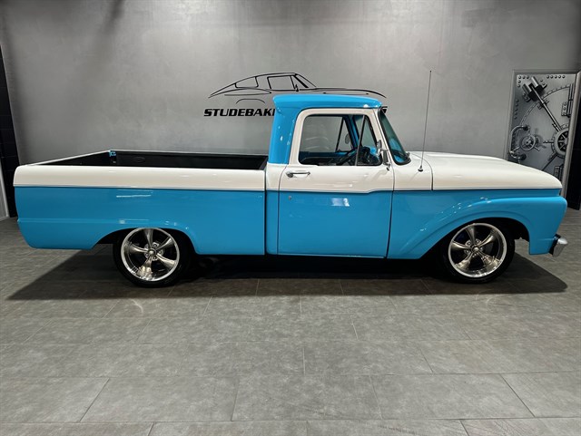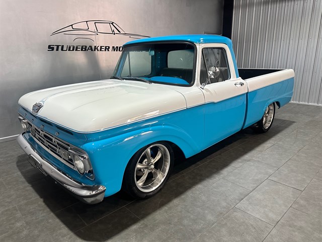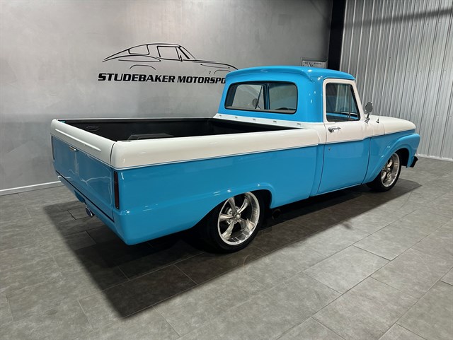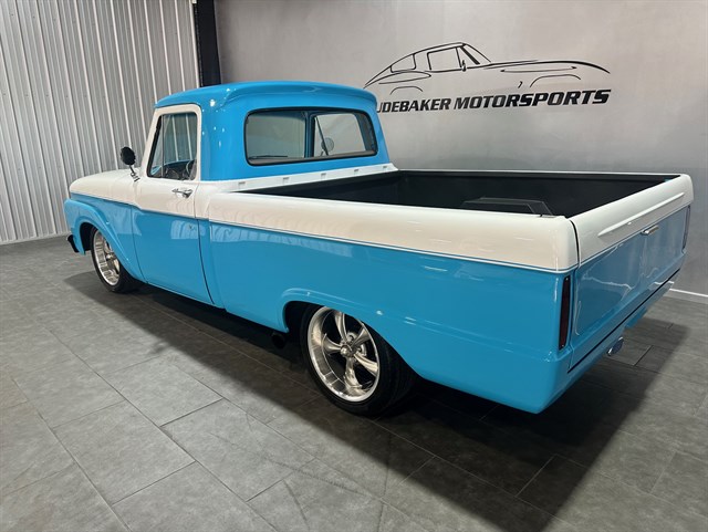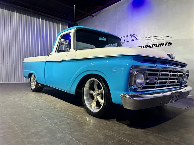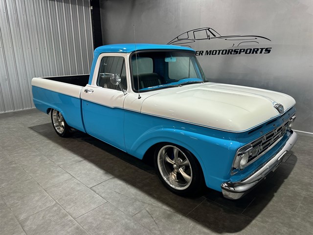 Here’s a solid, classic 1964 Ford F100 pickup truck with 5,483 miles since the build! The beautiful two-tone blue and white exterior looks incredibly clean and sharp with its gloss and shine; you’ll turn heads wherever you go! Features a stunning wood panel bed, chrome bumper and custom roll pan!