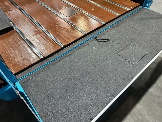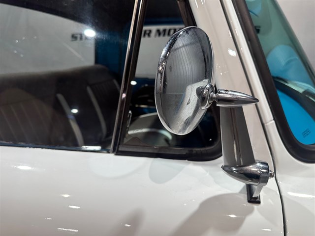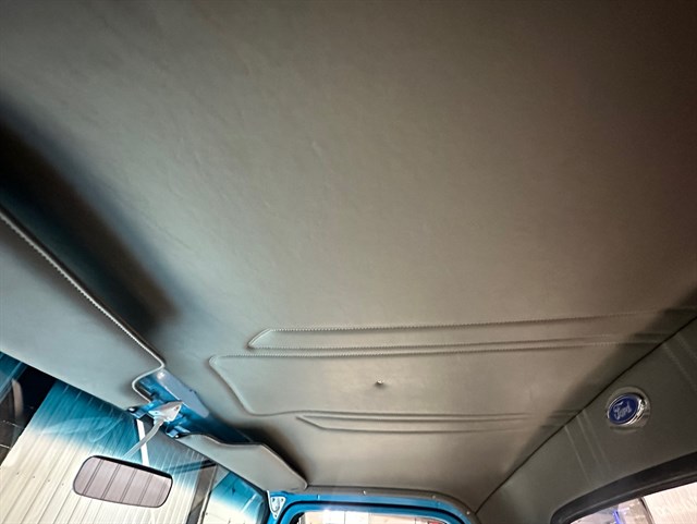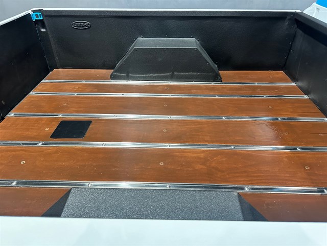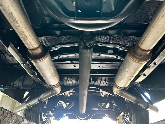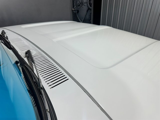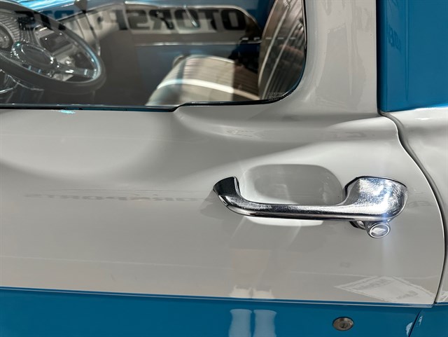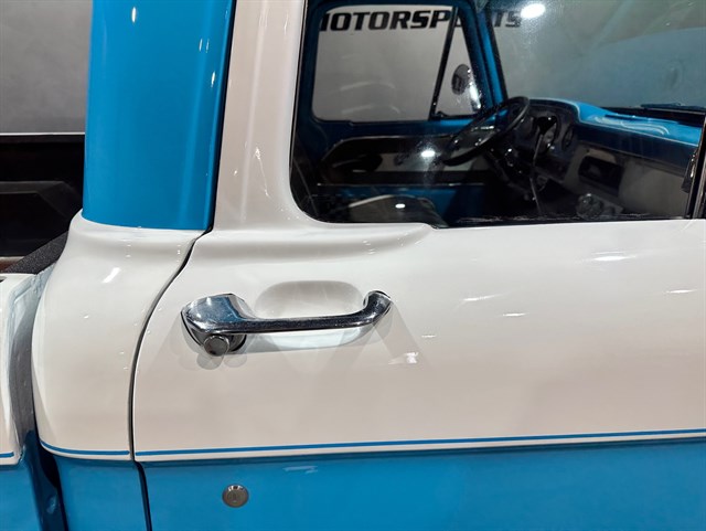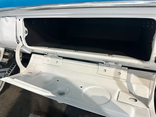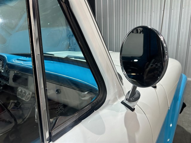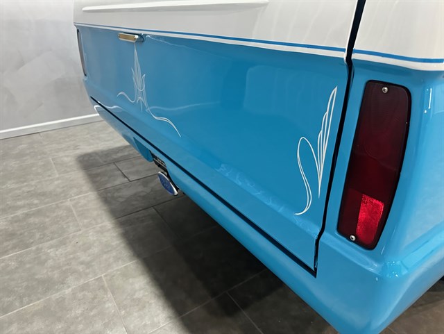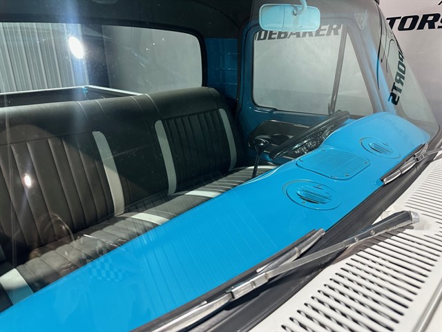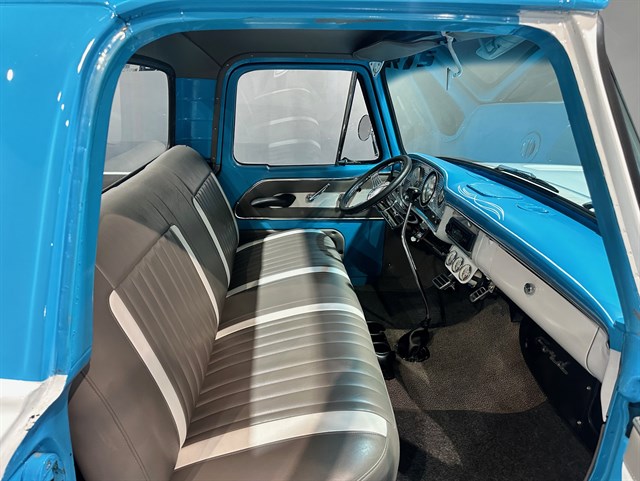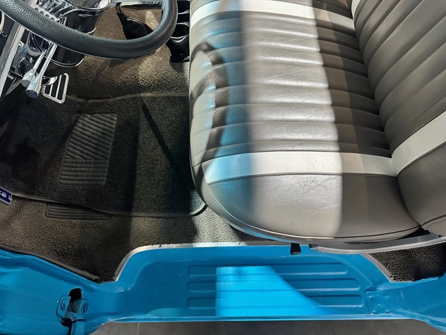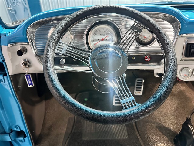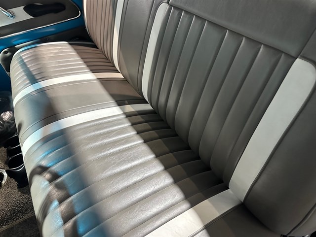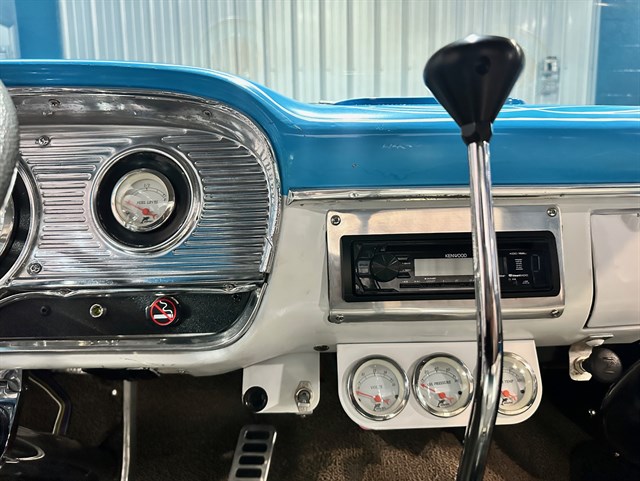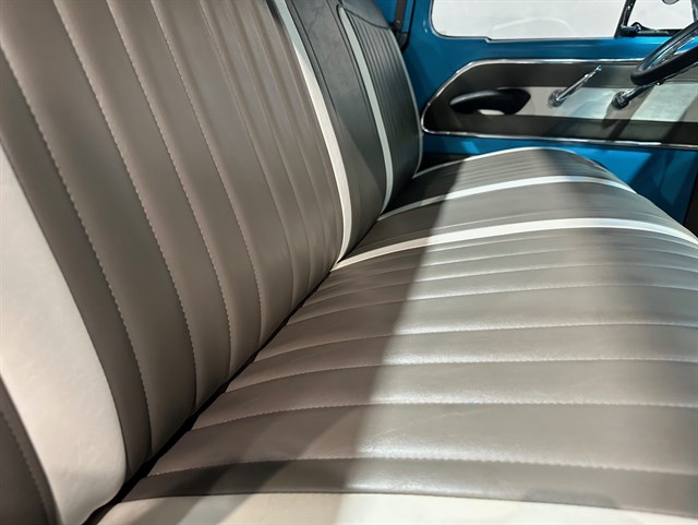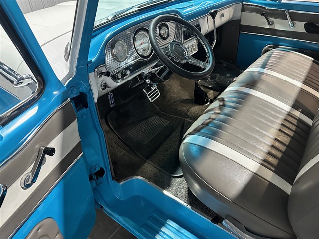 The interior is just as nice with the custom gray and white detailed bench seat and door panels. More of the inside offers tilt wheel, Dolphin gauges and a Kenwood radio system with Bluetooth and USB port.